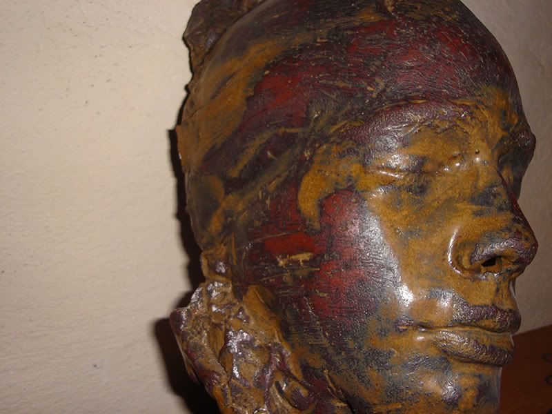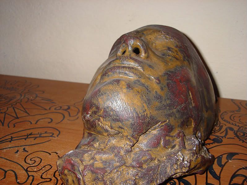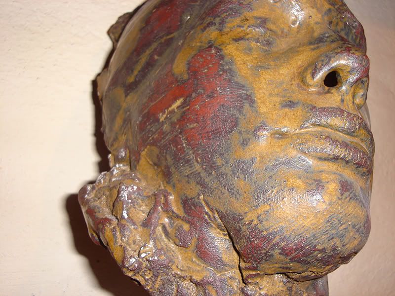 Esta mascara de arcilla se cocina, y luego se esmalta con oxido de tono rojiso y un esmalte oscuro.El resultado...